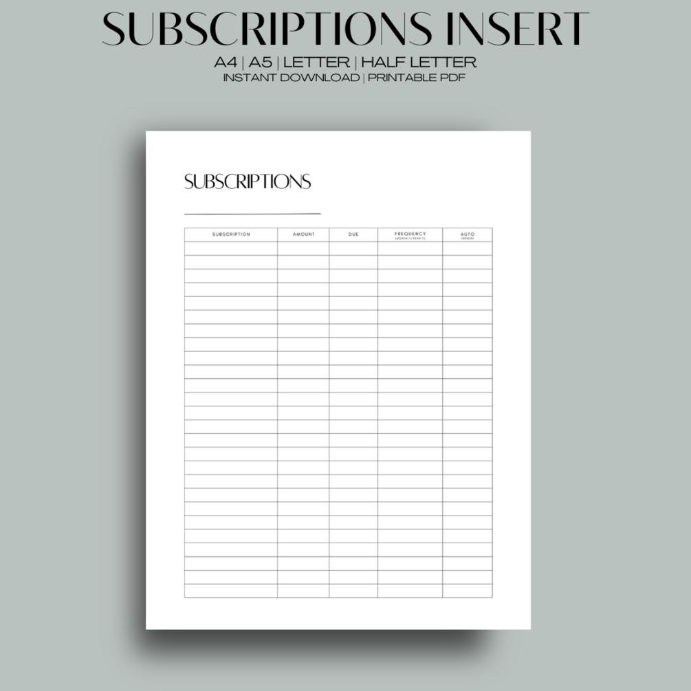 Subscriptions Insert, Subscription Tracker, Expense Tracker, Bookkeeping, Budget Planner, Printable PDF, A4/A5/Letter/Half, Instant Download